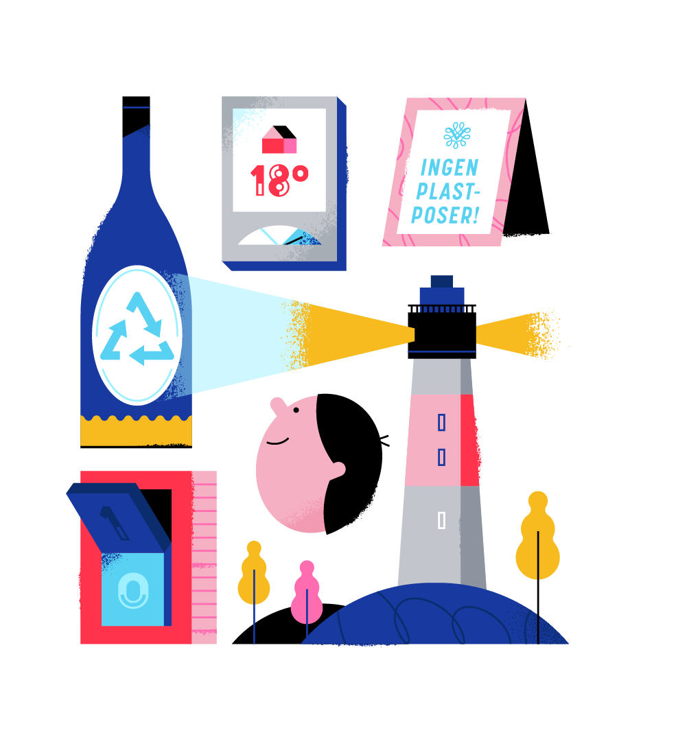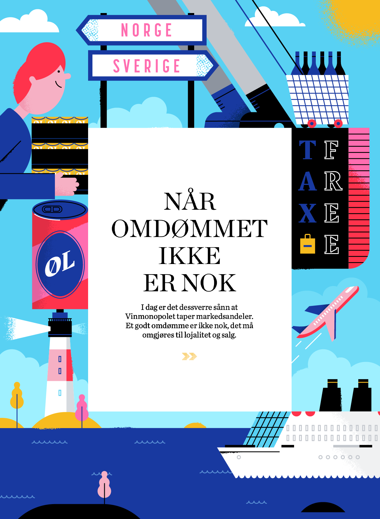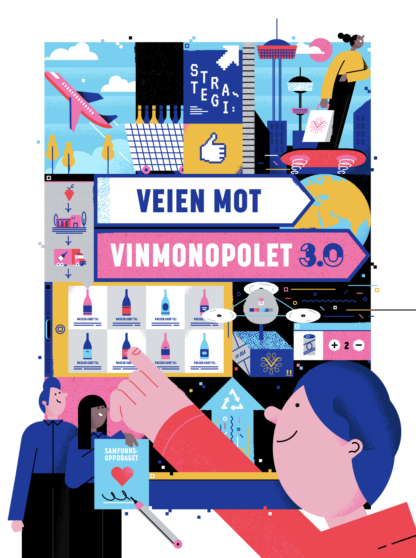 To buy wine, spirits and strong beer in Norway they have Vinmonopolet. A modern chain with a social responsibility, fully owned by the state. Through Spoon I got to illustrate the cover of their magazine in the theme of “Vinmonopolet 3.0” – what does it look like in the future? Everything from drone delivery, increased social responsibility, the threat of bootleg alcohol… and customers on hover boards (Marty McFly style) apparently.